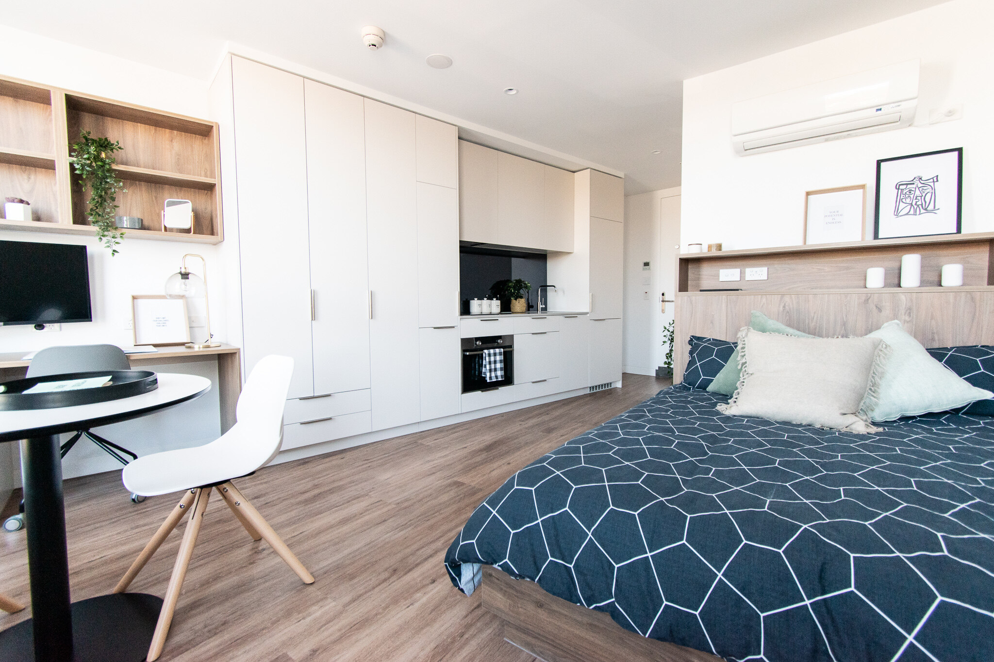 The room types mainly include studio and en-suite, which are all fully furnished. Communal amenities include a study room, a gym, a communal kitchen, a laundry room and 24-hour front desk management. It has high levels of safety and convenience. In addition, its distinctive sky lounge and rooftop gym can offer you an amazing panoramic view of the Melbourne skyline. The overall rent is at an above-average level, but it includes utilities and internet fees, making it easier to control the budget. It is suitable for new students who do not want to deal with bills frequently.