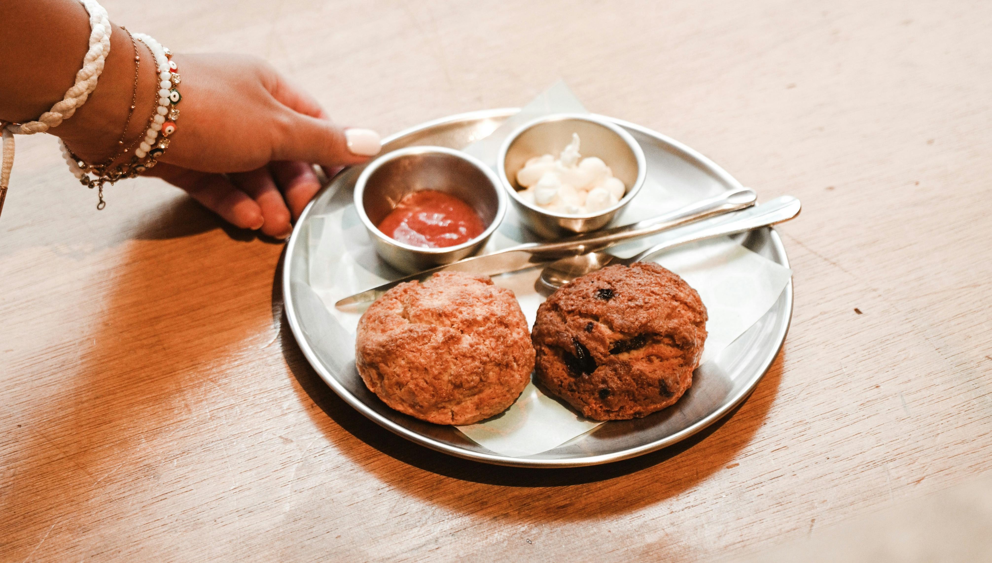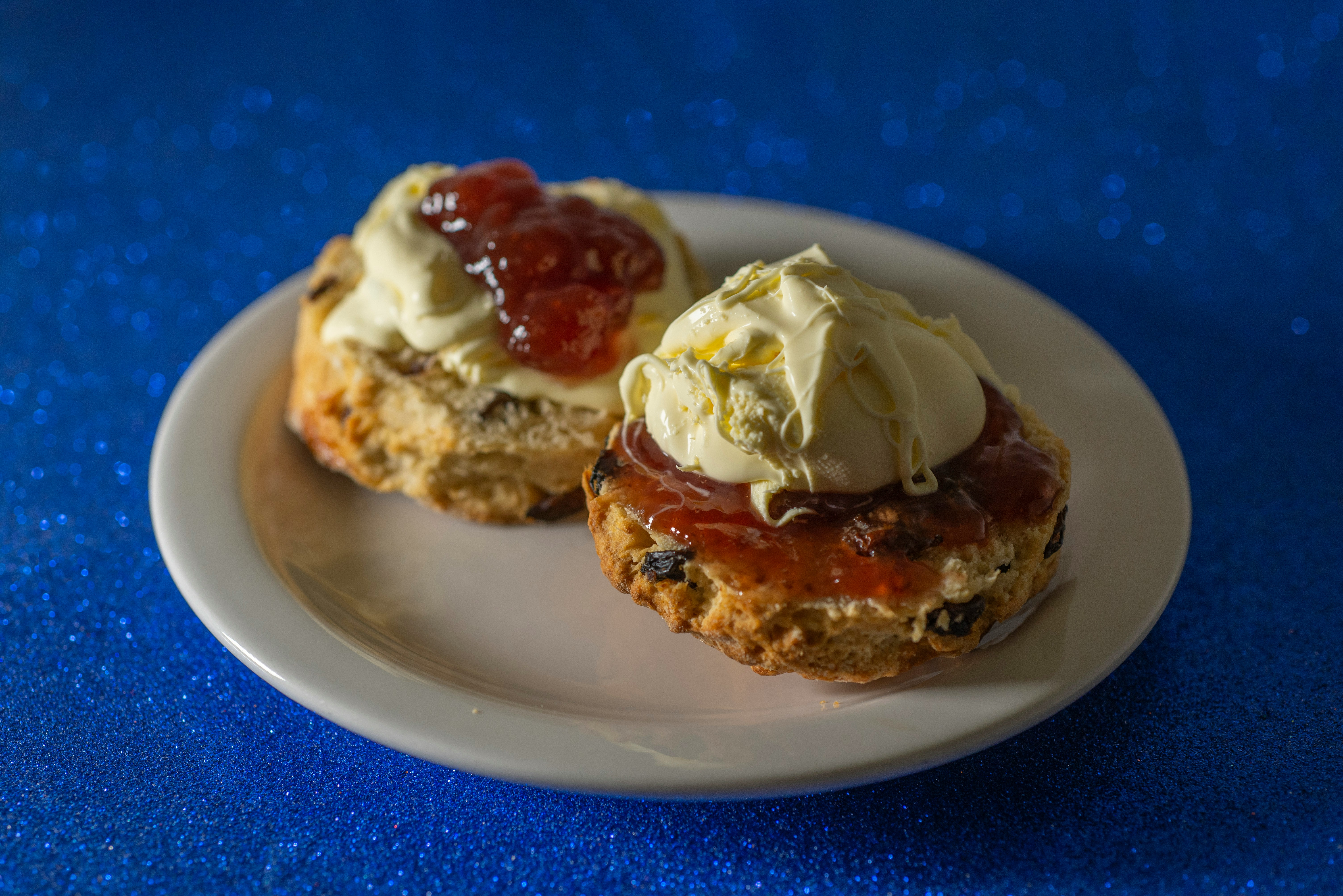 A traditional British cream tea is centred around scones with jam and clotted cream. These warm, fluffy scones are cut in half and topped with a lot of strawberry jam and thick, rich Devon or Cornish clotted cream. This fancy but comforting treat is a must-have for afternoon tea, and it often leads to friendly arguments about whether to put the jam or the cream on first.