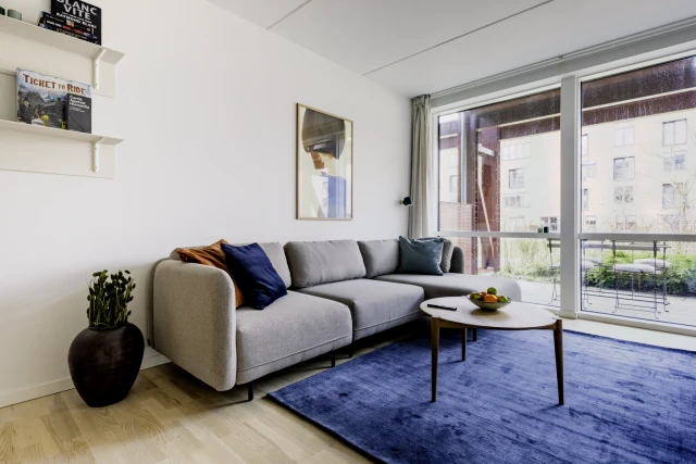 The apartment is on the ground floor in a modern building in the up and coming district of Valby. The apartment consists of 4 single bedrooms, 1 spacious shared bathroom and a living room with a modern open kitchen and exit to a private terrace.