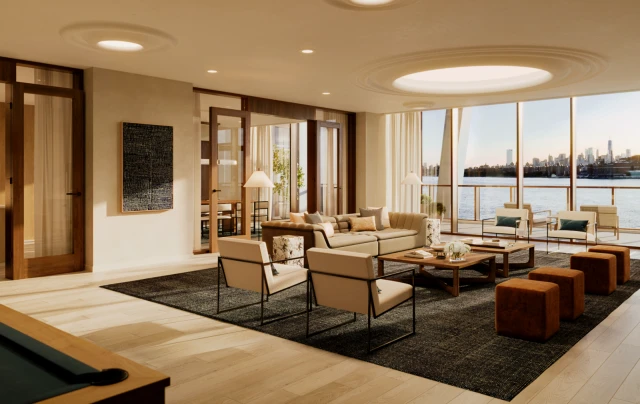 The Riverie is a new all-electric, geothermal-powered residential development on the Greenpoint waterfront. It consists of two towers (37 & 20 stories) connected by a podium, offering studios, one-, two-, and three-bedroom apartments as well as select townhomes. Interiors feature in-unit laundry, stainless steel appliances, and oversized windows. Building amenities include a fitness center with yoga studio & sauna, coworking spaces, children’s playrooms, music & podcast rooms, a speakeasy lounge, demonstration kitchen, rooftop pool and decks, barbecue areas, pet-wash stations, and a public waterfront esplanade with resilient design and retail space